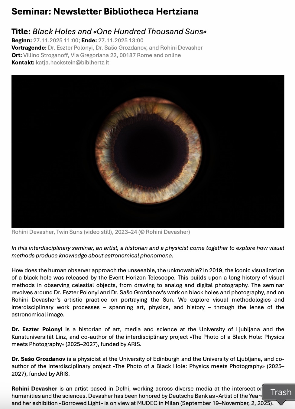In this interdisciplinary seminar, an artist, a historian and a physicist come together to explore how visual methods produce knowledge about astronomical phenomena. How does the human observer approach the unseeable, the unknowable? In 2019, the iconic visualization of a black hole was released by the Event Horizon Telescope. This builds upon a long history of visual methods in observing celestial objects, from drawing to analog and digital photography. The seminar revolves around Dr. Eszter Polonyi and Dr. Sašo Grozdanov’s work on black holes and photography, and on Rohini Devasher’s artistic practice on portraying the Sun. We explore visual methodologies and interdisciplinary work processes – spanning art, physics, and history – through the lense of the astronomical image.